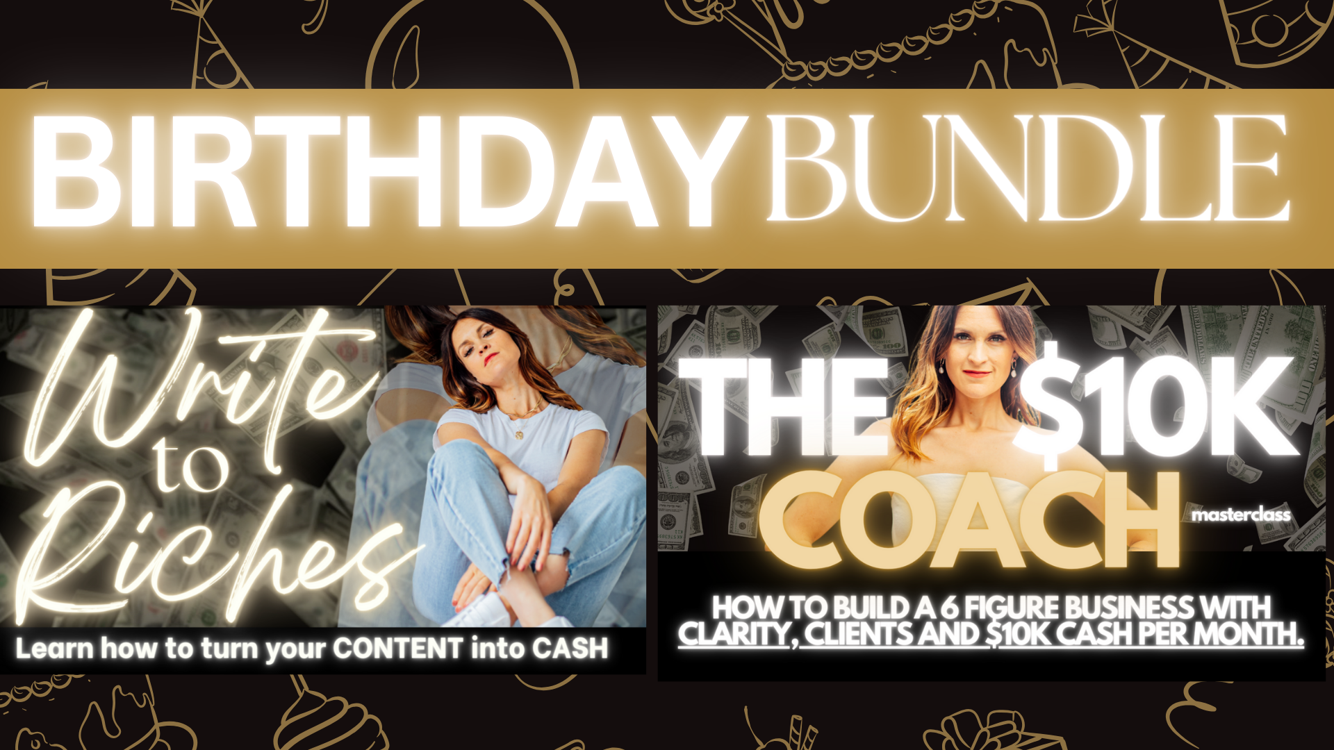 WRITE TO RICHES (Learn how to turn your CONTENT into CASH!), and THE $10K COACH (How to build a 6 Figure Business w/ $10k cash per month).